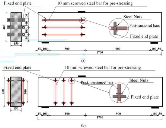 The second beam group, G2, had four beams: B0, Pr-H, Pr-V, and Pr-I, as tabulated in Table 1. Schematic details of these beams are given in Figure 3. Besides the master non-strengthened beam B0, three beams were strengthened using post-tensioning steel bars. The three beams, Pr-H, Pr-V, and Pr-I, were labeled representing the tested variables as follows: the post-tensioning was presented through the first letters of Pr, while H, V, and I point to the horizontal, vertical, and inclined position of the steel bars, respectively. This group aimed to investigate using EBR post-tensioned steel bars as a shear-strengthening method.