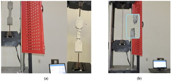 Normal Concrete (NC) with the mix design given in Table 2 was used for constructing all RC beams. In addition, flowable ECC was used to re-cover the beams in the first group. The mix proportions of ECC are described in Table 2. The concrete compressive strength (fc′) presented in Table 1 was obtained from testing three cylindrical samples with a 150 mm and 300 mm diameter and height, respectively, on the day of experimentation. In addition, tensile tests with a 0.10 mm/min loading rate were carried out on dog-bone specimens for each concrete type, as shown in Figure 4a, to depict the tensile stress–strain response.
