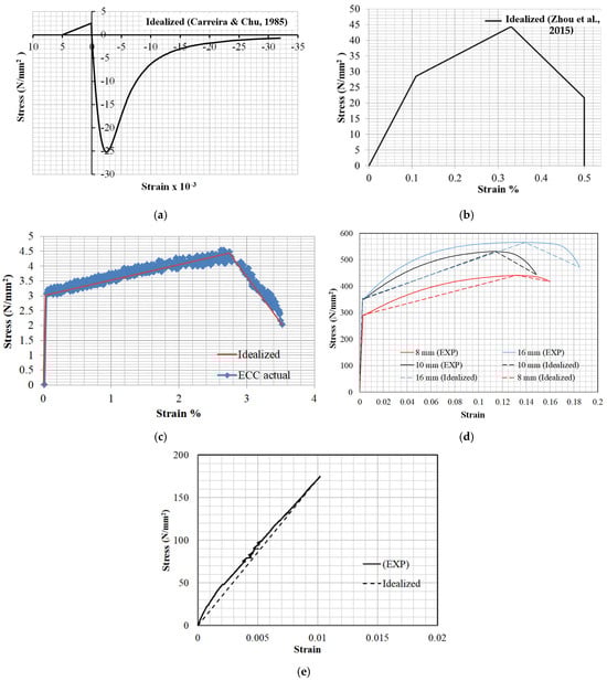 The Concrete Damage Plasticity (CDP) model available in ABAQUS was considered for modeling both the NC and ECC used herein. This model was selected for its high precision in defining compressive and tensile characteristics. The NC stress–strain relationship used for modeling is depicted in Figure 5a, aligning with the performance proposed by Carreira and Chu [] considering the experimental tests.