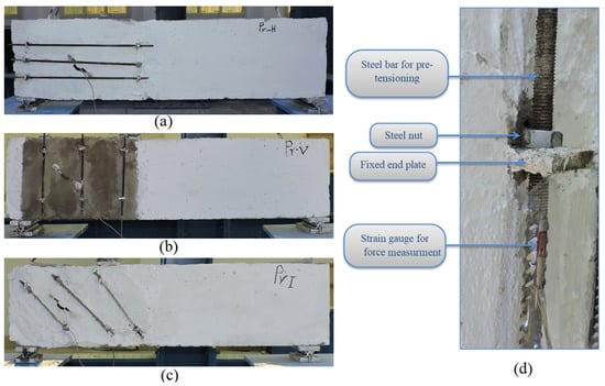 Strengthening implementation using external post-tensioning steel bars of group G2: (a) Beam Pr-H, (b) Beam Pr-V, (c) Beam Pr-I, and (d) manual post-tensioning procedure.