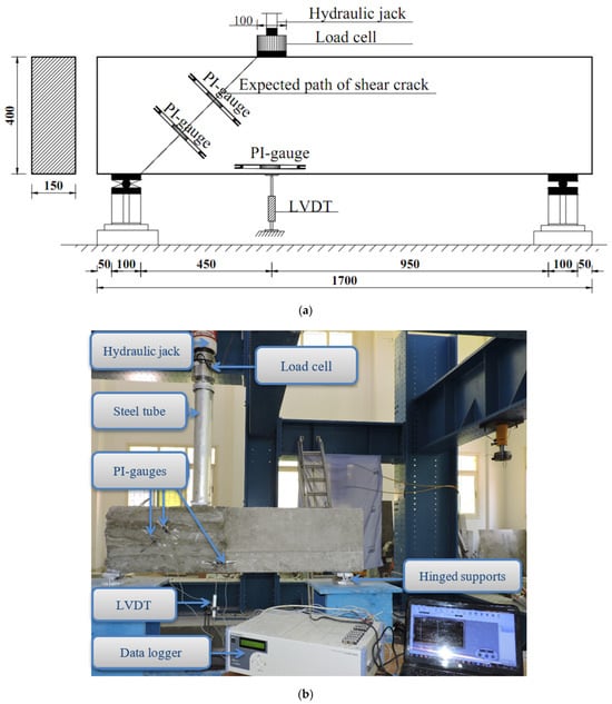 Test setup of the beams. (a) Geometric details and (b) the view of the experimental set-up.