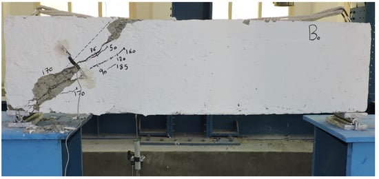 Generally, the control NC beam subjected to shear stresses formed major inclined cracks appearing diagonally at the mid-depth of the shear zone at the line connecting the load location and the support, as evidenced by beam B0 shown in Figure 9. It was found that the first visible hairline crack was recognized at a load close to 82 kN (about 44% of Pu). Then, the significant crack opening gradually widened, associated with small cracks extending towards the steel plates. Just before collapse, all diagonal cracks impressed with a wider opening width, leading to damage to the concrete strut and, consequently, beam failure, as presented in Figure 9. Table 3 illustrates that B0 achieved Pu of about 186 kN.