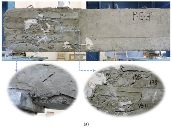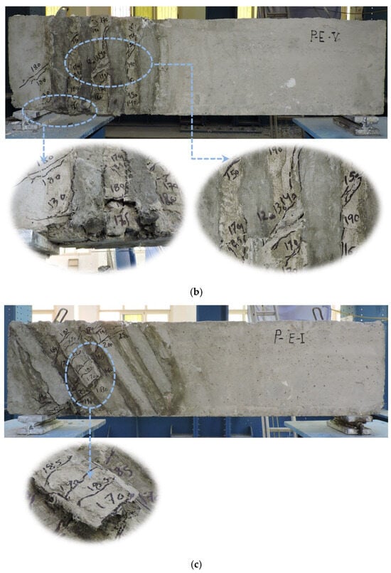 Crack patterns and failure modes for group G1 strengthened with NSM PFs and ECC: (a) P-E-H; (b) P-E-V; and (c) P-E-I.