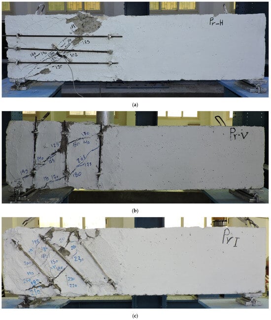 Crack patterns and failure modes for post-tensioned group G2: (a) Pr-H, (b) Pr-V, and (c) Pr-I.