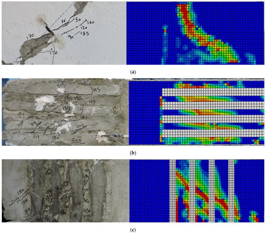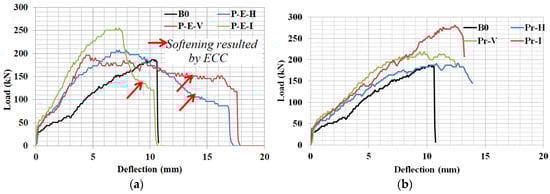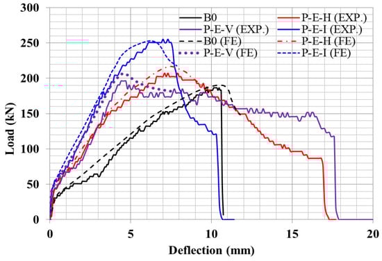 The developed FEM was compared and verified with four experimented beams, B0, P-E-H, P-E-V, and P-E-I, to examine the accuracy of the numerical analysis. The validation was conducted by comparing the load-deflection relationship, crack pattern, failure mode, and ultimate load values. Figure 16 compares the load-deflection response estimated numerically together with that observed experimentally. Generally, all models performed linearly up to the level close to the cracking stage, followed by a nonlinear performance presenting a semi-hardening response up to the peak load. Then, similar to the earlier discussion about softening behavior contributed by ECC, the developed FEMs perfectly predicted the same softening behavior beyond the ultimate stage until collapse. The predicted initial stiffness of the tested beams closely matched the test observation, as can be seen from Figure 16.