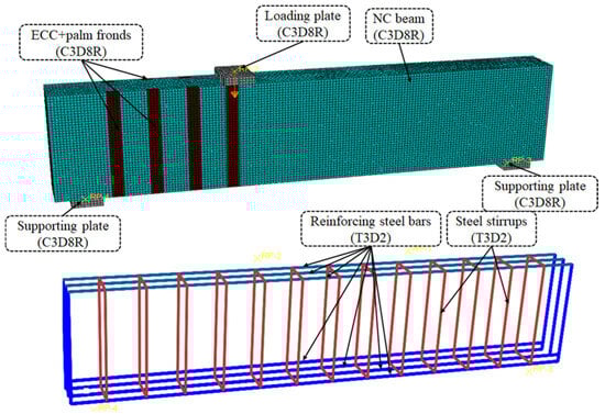 The numerical simulation for FEM was constructed to be identical to those examined experimentally. To accurately represent the concrete elements along with the loading and supporting plates, eight-node linear reduced integration solid elements (C3D8R) were used. Also, the strips of ECC and PFs were modeled as solid elements (C3D8R). The steel bars were modeled as two-node linear 3D truss elements (T3D2), as illustrated in Figure 13. In the constructed model, a single increasing load was applied at the third-span length, imitating the experimental one, as presented in Figure 15.