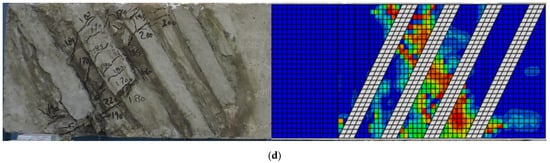 Comparisons of the failure modes of the tested beams with the numerical predictions (a) beam B0, (b) P-E-H, (c) P-E-V, and (d) P-E-I.