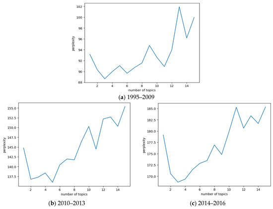 This study examined the interdisciplinary literature across five distinct time periods: 1995–2009, 2010–2013, 2014–2016, 2017–2019, and 2020–2023. The division of these phases was determined by the presence of adequate textual data, with approximately equal numbers of documents in each phase. The optimal number of topics within the literature for each time interval was identified using the perplexity parameter of the LDA model. Specific calculation results are presented in Figure 10.