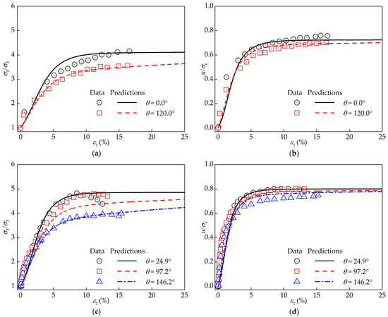 The anisotropic MCC model is used to predict the stress ratio and pore pressure (normalized by the consolidation pressure ) of the horizontally deposited San Francisco Bay mud from true triaxial tests (Kirkgard and Lade [42]). This soil is normally consolidated. Under the same intermediate principal stress coefficient , the Lode’s angle can be different when the principal stresses are along different directions: if , is the major principal stress; if , is the intermediate principal stress; and if , is the minor principal stress. The model parameters are , , , , , , and . Comparisons between the experimental data and model predictions are shown in Figure 8. It can be concluded that the proposed method can reasonably simulate soil behaviors under different loading directions and intermediate principal stress coefficients. What is more, if the vertical strain continues increasing, and (as well as ) finally converge to a stable value independent of the loading direction, which means the proposed method can guarantee the uniqueness of the critical state line. When , the model predictions slightly deviate from the experimental data and cannot reproduce the decrease in with . This is probably due to the strain localization of the soil specimen under the condition of extension, which cannot be simulated using the MCC model.