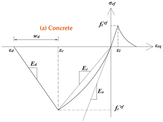 The concrete stress–strain relation can be seen in Figure 3a. The relation comprises two main parts, compression and tension. In the uncracked compressive part, the algorithm recommended by the CEB-FIB Model Code [9] is followed. The equations used are suitable for all types of concrete according to the code. At the onset or after reaching the maximum compressive strength, the relation becomes a perfectively gradient descent line between the compressive stress and strain. In the uncracked tension part, the relation is linear up to the tensile strength of the concrete. Once cracks occur, the behavior is a downward curve that follows the relationship or the mathematical formulas of Hordijk [10].