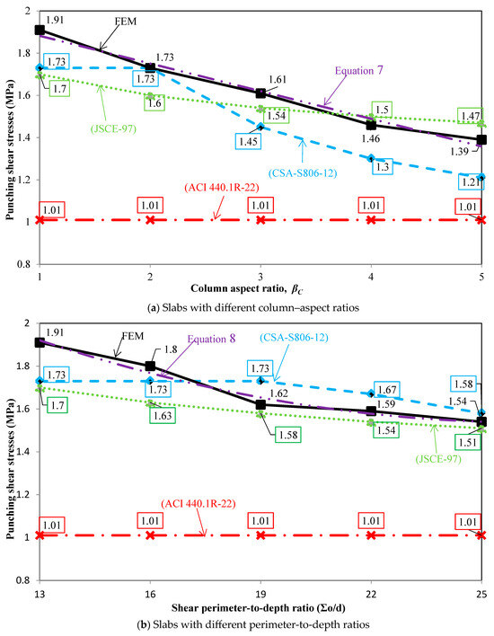 The equation is based on a mathematical work [19]. According to the article, all the experimental work that was conducted on FRP-RC slab–column connections up to that date was collected and mathematical efforts were undertaken to come up with Equation (5), which was adapted from 2006 by the ACI committee 440 [20]. The code considers only five items in relation to the punching shear capacity of the slab–column connections: the effect of the column’s perimeter, concrete compressive strength, reinforcement ratio, elastic modulus of the reinforcement, and concrete in the factor called .