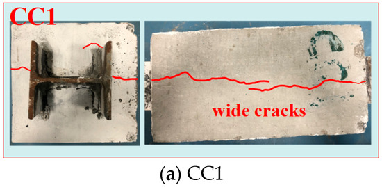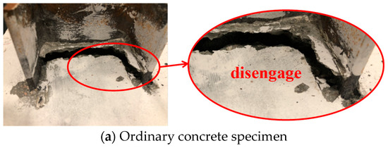 For ordinary concrete specimens, there was no crack in the initial loading process. With the increase in the push-out load, the splitting cracks began to appear in the middle of the flange at the loading end and gradually extended to the free end. Then, with a “bang”, the width and length of the crack increased rapidly. The ordinary concrete specimen underwent a typical brittle splitting failure (see Figure 4a). Figure 5 demonstrates the interface at the free end between the shaped steel and matrix for the ordinary concrete and ECC specimens after the test. In Figure 5a, it can be seen that the concrete at the tip of the flange is crushed. The shaped steel and concrete at the web were obviously detached, resulting in a large gap at the interface.