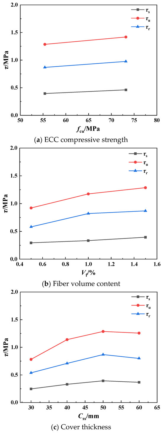 As the ECC compressive strength increased, the initial, ultimate, and residual bond strength exhibited an improvement trend (see Figure 7a). Compared with specimen S1, the initial, ultimate, and residual bond strength of specimen S2 enhanced by 16.87%, 10.36%, and 12.58%, respectively. This suggested that the increase in the ECC compressive strength played an important role in improving the bond property of the interface between the shaped steel and ECC.