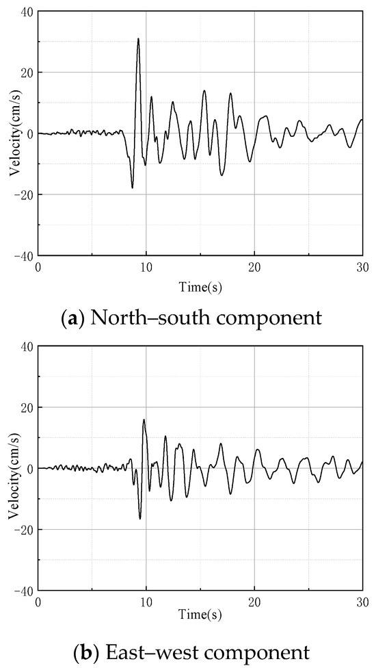To reconstruct the seismic field, this study assumed that the bridge is located within the smart array. The seismic station was built on a harder geological formation and has a single site condition within the array. The recording instruments are all digital tape-recording strong seismometers, ensuring consistency in earthquake recordings within a small area. Since the array’s construction, numerous earthquakes have been recorded in the near-fault region, providing valuable data for studying near-fault ground motion in a small area. This project focused on the study of the near-fault effects and impacts of nonuniform effects on bridge structures. Therefore, the Baker method was employed to identify near-fault ground motions [40]. The Baker method stands as a classic and highly effective approach. Firstly, it is a well-established and widely acknowledged technique specifically designed to identify near-fault ground motions, particularly those characterized by high-energy velocity pulses. These pulses, which are emblematic of near-fault earthquakes, can exert a profound influence on the response of structures, notably bridges. By utilizing the Baker method, this study aims to precisely capture these velocity pulses and their consequential impacts within the analysis. Secondly, the Baker method capitalizes on the localized focusing properties of wavelet transforms, enabling it to efficiently discern high-energy velocity pulses within seismic records. This capability is paramount in near-fault regions, where ground motions are intricate and highly nonlinear in nature. By leveraging wavelet analysis, the method adeptly navigates the complexities of near-fault seismicity, ensuring accurate pulse identification [41].