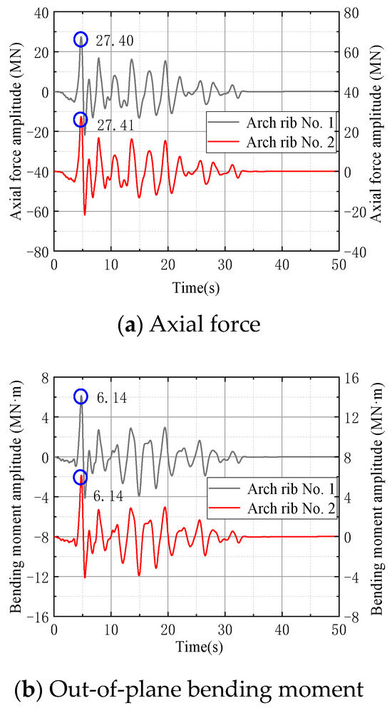 When comparing the structural responses under the combined effects of near-fault ground motion and spatial variability with those under only near-fault effects, significant differences are observed mainly at the arch foot, while the differences at the arch top are relatively small. Specifically, due to the pulse effect in both scenarios being influenced by near-fault ground motion, the difference in structural responses at the arch top is only 7.718%. However, without the influence of spatial variability, the response at the arch foot is 24.34% smaller than when affected by both near-fault effects and spatial variability simultaneously.