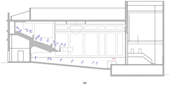 The objective parameters of the venue were assessed by conducting a measurement following the guidelines of ISO 3382-1 (Figure 2) [26]. The impulse response was recorded in 20 positions in the audience plane, which is non-symmetrical in relation to the room axis. The sound source was placed in the middle of the apron (Figure 1). The sound source was located near the edge of the scene because, according to local musicians, in this specific venue, performers tend to play near the edge of the scenario, as they claim they hear themselves better. The intention was to replicate the actual performance conditions in the measurements. The microphone was placed in locations where there are people seated in attendance. In Figure 1, positions 11 and 13 are located in an area without permanent padded seats, but with regular movable velvet chairs. The measurements were taken with no audience. The process was carried out using DIRAC software v3.1, which uses sine sweeps as excitation signals to obtain the impulse response at each position. The software averages arithmetically the results of two consecutive measurements following the ISO 3382-1 guidelines [26]. A Brüel & Kjäer 4296 OmniPower omnidirectional speaker was used as the sound source, and a Shure KSM44A omnidirectional microphone was used to register the signal (Shure, Chicago, IL, USA). The sound source was placed 150 cm from the floor, and the microphone was 144 cm high. A single sound source position was used because if the materials and geometry of the room ensure an even distribution of sound absorption and diffusion properties, a single source position, combined with multiple microphone positions, can still provide a representative average of the acoustic parameters. The parameters evaluated from the impulse response were the EDT (early decay time), TR10 (reverberation time measured with a 10 dB decay), TR20 (reverberation time measured with a 20 dB decay), TR30 (reverberation time measured with a 30 dB decay), C80 (clarity; early sound energy that arrives at the listener within 80 ms), D50 (definition; the ratio of the early received sound energy, 0–50 ms after direct sound arrival, to the total energy), and STI (speech transmission index) [27].
