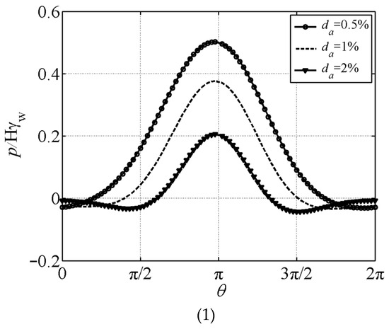 Figure 5 shows the distribution of the pore pressure on the pipeline surface when the gas content in the pore water changes. Figure 5 (1) and (2), respectively, show the situation of the wave peaks and valleys passing by. From the figure, it can be seen that changes in the gas content have a significant impact on the pore pressure amplitude on the pipeline surface: as the gas content increases, the pore pressure amplitude decreases. Meanwhile, it can be seen from the figure that, as the gas content increases, the amplitude of the pore pressure in the lower part of the pipeline gradually approaches zero.