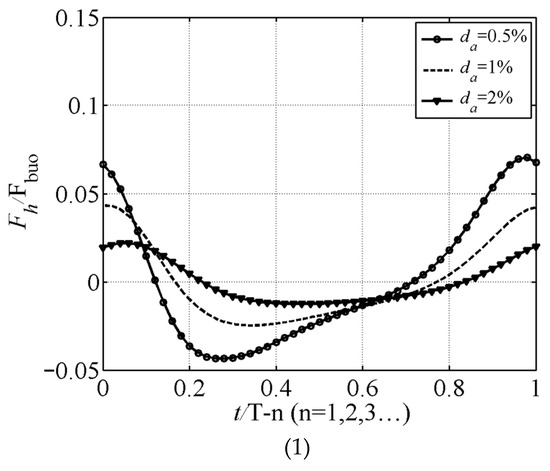 Figure 6 shows the variation in the horizontal and vertical forces acting on the concrete pipeline during a cycle over time when the gas content in the pore water changes. From Figure 6 (1), it can be seen that the amplitude of the force acting on the pipeline decreases with the increase in the gas content; when the gas content changes from 0.5% to 2%, the amplitude of the horizontal force acting on the pipeline changes from about 0.07Fbuo to about 0.02Fbuo. From Figure 6 (2), it can be seen that the gas content has little effect on the upward permeability of the pipeline. This is because as the gas content increases, the water content in the seabed will decrease, and the seepage force will also change accordingly, which will affect the reduction in the pore pressure on the pipeline surface. The horizontal and vertical forces acting on the pipeline will also decrease.