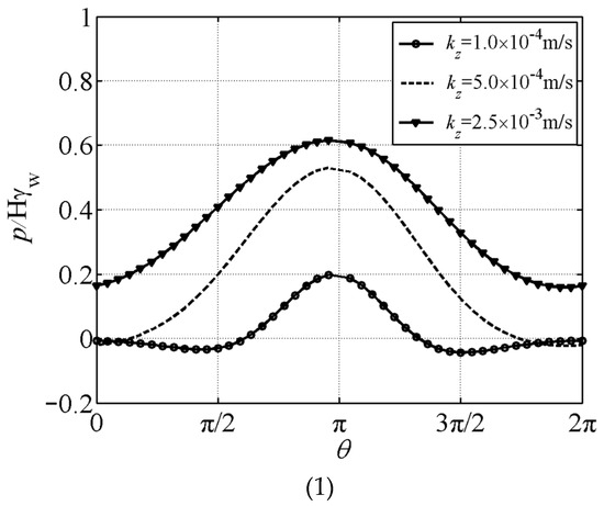 Figure 7 shows the effect of changes in the seabed permeability coefficients on the distribution of pore pressure on the concrete pipeline surface. Figure 7 (1) and (2) correspond to the pore pressure on the pipeline surface when the wave crest and trough pass through, respectively. From the figure, it can be seen that the permeability coefficient of the seabed has a very significant impact on the pore pressure, and as the permeability coefficient increases, the amplitude of the pore pressure gradually increases. When the permeability coefficient is 1.0 × 10−4 m/s (kz = kx), the pore pressure amplitude in the lower part of the pipeline is close to zero, because the depth of the wave influence is shallower when the permeability coefficient is small, and the lower part of the pipeline is less affected by waves.