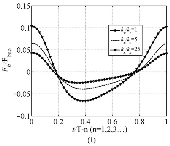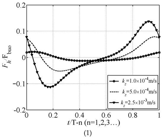 Figure 8 shows the influence of changes in the seabed permeability coefficient on the horizontal and vertical forces acting on the concrete pipeline. It can be seen in the figure that the permeability coefficient has a significant impact on the horizontal force acting on the pipeline. When kz is 1.0 × 10−4 m/s (kz = kx), the magnitude of the horizontal force is close to zero. When kz is 2.5 × 10−3 m/s (kz = kx), the magnitude of the horizontal force can reach about 0.15Fbuo. From Figure 8 (2), it can be seen that the permeability coefficient has little effect on the maximum upward force acting on the pipeline. This is because waves propagate horizontally, and as the permeability coefficient increases, the horizontal seepage velocity of water in the seabed increases due to the action of the waves, and the permeability coefficient has a significant impact on the horizontal force acting on the pipeline. As the permeability coefficient increases, the pore pressure on the surface of the pipeline also increases, and the horizontal force acting on the pipeline shows an increasing trend. However, the vertical seepage velocity of water in the seabed has a relatively small impact; therefore, the change in the permeability coefficient has little effect on the maximum upward force acting on the pipeline.