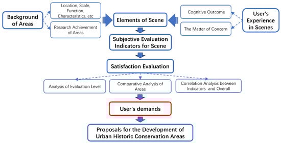 Therefore, based on the overall research concept, a subjective evaluation framework for scenes (Figure 1) was developed with the core focus on users’ demand for urban historic conservation areas. This evaluation framework starts from the “user’s demands” (the red box in Figure 1) and is derived upwards. Understanding the demands of users for urban historic conservation areas and their underlying reasons can be obtained from their opinions on the current status of the areas.