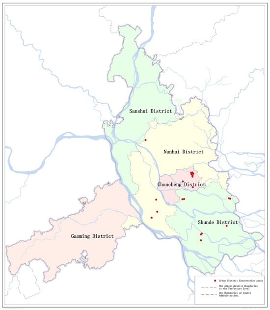 The distribution of urban historic conservation areas in Foshan City (the picture was adapted from the standard map of Foshan City Natural Resources Bureau: Permit No. GD ES (2022) 011).