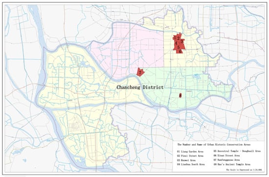 The distribution and numbering of urban historic conservation areas in Chancheng District (the picture was adapted from the standard map of Foshan City Natural Resources Bureau: Permit No. GD ES (2022) 002. The non-English terms in the map show the names of roads and railways).