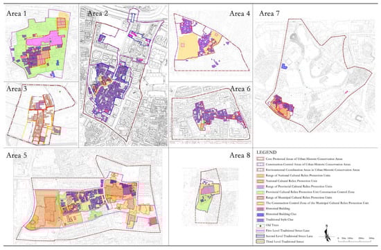 The Chancheng District is the most densely populated old urban area in Foshan, with an area of 153.91 square kilometers, accounting for approximately 4% of the total city area. It has a permanent population of around 1.33 million people, constituting about 13.9% of the city’s total population [,,]. Within the district, eight urban historic conservation areas are situated in the northeast (Figure 3 and Figure 4). Areas numbered 1 to 6, covering an area of 121.3 hectares (the data include the core protection area, the construction control area, and the environmental coordination area of the urban historic conservation areas; data source: Foshan Natural Resources Bureau, https://fszrzy.foshan.gov.cn/, accessed on 27 November 2023), are home to numerous traditional buildings and renowned historical and cultural heritage sites. They also serve as important urban centers for residential, commercial, leisure, and educational activities [].