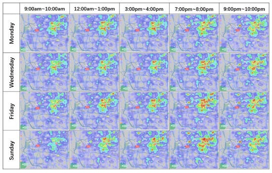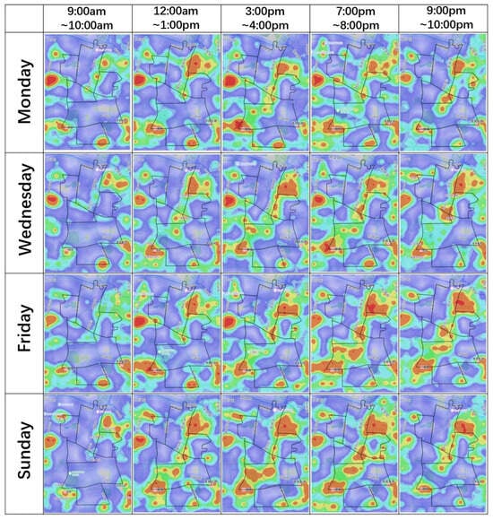 The heatmap of Areas 1–6 is presented in Figure 6, with the black box representing the area boundary. The degree of population concentration is lower during the morning and after 10:00 p.m., gradually increasing after 3 p.m. until reaching a peak between 7 p.m. and 8 p.m. Throughout Monday to Thursday, there is minimal variation in this pattern; however, on Friday evenings, the degree of aggregation significantly surpasses that of Monday to Thursday and even exceeds weekend levels during the sampling period. On weekends, high aggregation begins around noon with minimal fluctuations thereafter, resulting in an overall balanced state of spatial concentration.