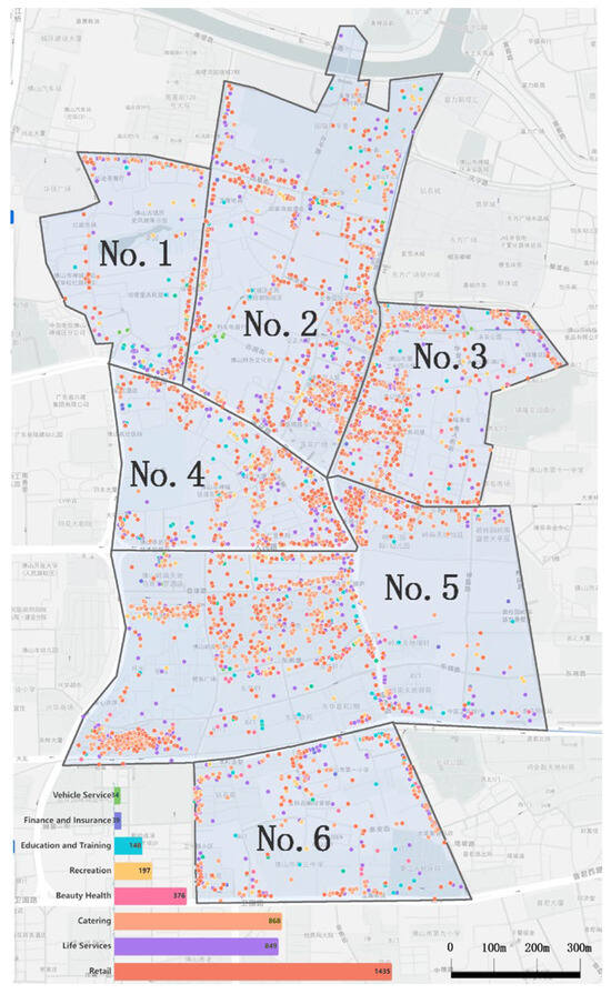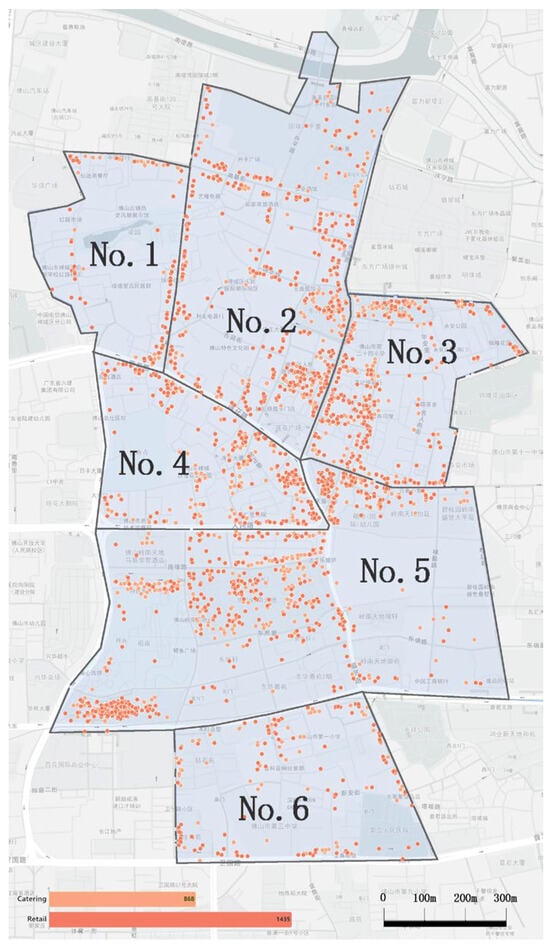 The POI map for catering and retail in Area 1–6 (the map is based on the study area map and re-drawn using obtained POI data. In addition, the terms in the map show the names of roads and buildings).
