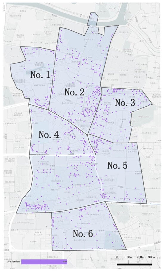 The POI map for life services in Area 1–6 (the map is based on the study area map and re-drawn using obtained POI data. In addition, the terms in the map show the names of roads and buildings).