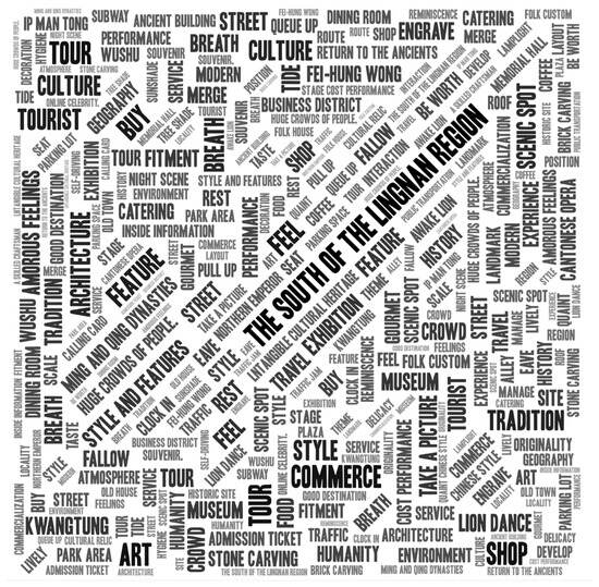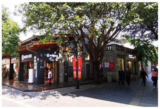 Based on the user evaluation information extracted from the online review and the on-site interview survey, users express less satisfaction with the integration of traditional architecture and modern trend commerce, particularly in the “Lingnan Tiandi” area within this area. Some users perceive an excessive commercialization, as many business forms and models resemble those found in areas like “Shanghai Xintiandi” or “Yongqing Fang”, thereby suppressing local characteristics (Figure 17 and Figure 18). Additionally, they believe that the infusion of trendy culture compromises the sufficient representation of traditional historical and cultural values and styles. However, many users also appreciate the revitalization efforts made in this area as they find it more appealing to preserve history and culture through a modern approach, which contributes to its economic revival. The outcome thus integrates both perspectives, resulting in a relatively positive assessment of the overall environment.