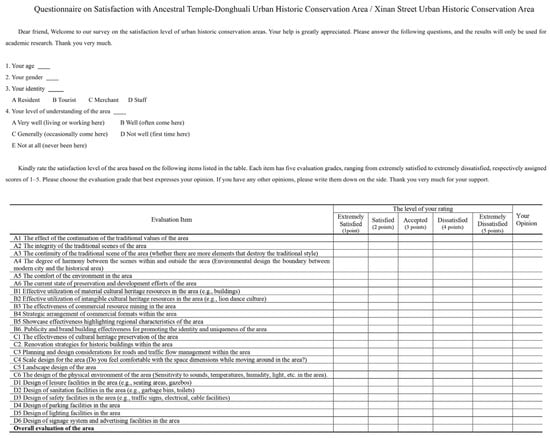 Utilizing the evaluation indicator set depicted in Figure 14, a questionnaire was developed (Figure 15), featuring five satisfaction levels for each indicator, “Extremely Satisfied”, “Satisfied”, “Accepted”, “Dissatisfied”, and “Extremely Dissatisfied”, corresponding to scores ranging from 1 to 5. To ensure targeted evaluation information acquisition, all questionnaires were completed on-site by randomly selected individuals representing various roles within the core protection areas.