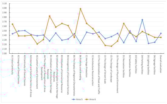 The data only provide the evaluation results, while the reasons for the evaluation result are derived from conversing with interviewees and observing and analyzing the scene. Through the data analysis and interview results, it was found that people have different evaluation standards for areas with varying levels of development. The cost of investment in protection and activation aspects in Area 5 is much higher than that in Area 6. Consequently, the presented scene of Area 5 aligns more closely with modern urban characteristics such as “cleanliness”, “beauty”, “orderliness”, and a strong sense of experience. On the other hand, Area 6 exhibits scenes characterized by free development and disorder; however, evaluators’ overall satisfaction level is not low. This leads to an inference that people exhibit a high degree of tolerance towards a historical area.