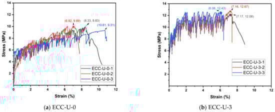 Tensile stress–strain curves of iron sand HS-ECCs at various UEA percentages.