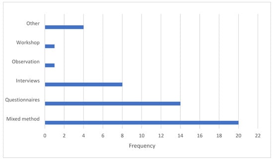 The 48 studies adopted several data collection methods on the barriers to the application of OSC (Figure 4). This involved the use of mixed methods (20 articles, 41.6%), questionnaires (14 articles, 29.2%), interviews (8 articles, 16.6%), workshops (1 articles, 2.1%), observations (1 articles, 2.1%), and other methods (3 articles, 8.4%). Nearly half of the research conducted employed a mixed-method approach to investigate the barriers; at total of 16 of which used both interviews and questionnaires, while others combined surveys and interviews with additional methods such as observation or group discussion [,,,]. Notably, studies [,] could arguably be considered mixed-methods, but they were classified as mono-method here for consistency in categorisation, as the use of additional methods was only briefly reported and not as a core part of the research design. These instruments are suitable because data on the importance and impact of barriers can be effectively gathered through the insights of practitioners and stakeholders. The superior adoption of questionnaires is especially justified, as they enable faster data collection, support quantitative analysis, and are widely used in construction management research []. Additionally, qualitative interviews serve as a valuable tool in construction management studies, as they allow for a deeper exploration of complex issues, enabling researchers to ask follow-up questions and examine sensitive topics more thoroughly []. Consequently, the studies included employed appropriate and robust methods to assess the barriers to the adoption of OSC.