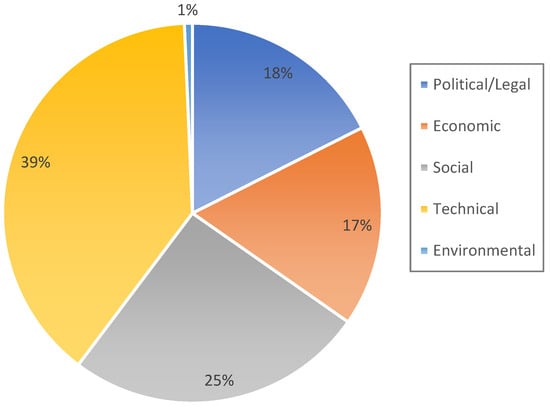 Table 1 provides a summary of 40 barriers identified in the literature. Each article was reviewed for barriers, and a frequency count was recorded and attributed to the source article. Across the 48 reviewed papers, a total of 377 references to barriers were identified. The barriers were ranked by frequency in ascending order and categorised according to the PESTLE framework (political, economic, social, technical, legal, and environmental) to structure the discussion. In this context, political and legal barriers were grouped to streamline analysis. The PESTLE analysis approach, originally based on Professor Francis Aguilar’s ETPS model [], is a strategic tool used to identify and evaluate key external factors influencing an organisation. It has become widely applied over time, across different contexts, to support managers and professionals in making informed strategic decisions. The PESTLE framework is particularly valuable for systematic reviews because it provides a comprehensive and structured lens for categorising diverse findings. By examining political, economic, social, technological, legal, and environmental dimensions, it helps synthesise and categorise complex information, highlight patterns, and ensure that critical external influencing factors are not overlooked.