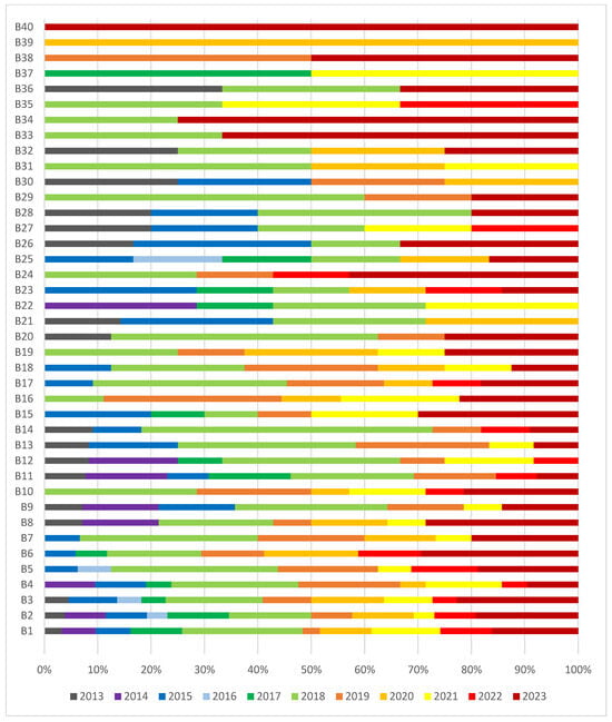 Figure 3 presents the number of articles included in this review by publication year, covering a decade from 2013 to 2023. The regression analysis shows a moderate positive correlation, demonstrating an increasing research interest in China, particularly over the last six years, with 81.25% of the 48 articles published during this period. This trend may reflect a growing commitment among researchers, practitioners, and stakeholders to address challenges to OSC adoption in the coming decades. A substantial increase is observed in 2023, with 23% of the reviewed articles published in that year alone. China’s target for 2025, which requires 30% of new annual construction to utilise prefabricated construction methods [], has likely contributed to the surge in publications focused on OSC by 2023. Additionally, a peak is evident in 2018 and 2019, possibly due to the implementation of policies and protocols in preceding years (see Section 3.3). Although research production may have been affected by the global COVID-19 pandemic, limited evidence exists to confirm this. Nonetheless, the sustained interest in OSC research and its outputs remains apparent.