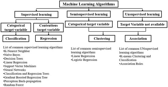 As illustrated in Figure 1, ML methods can be broadly categorized into supervised, semi-supervised, and unsupervised learning, each encompassing a variety of algorithms with distinct advantages and limitations. Supervised learning approaches—such as neural networks (NN), decision trees (DT), support vector machines (SVM), gradient boosting (GB), and regression analysis (RA)—are most commonly adopted in predicting concrete performance due to the availability of labeled experimental data. In contrast, unsupervised learning has been explored for clustering mix designs and anomaly detection. This classification framework provides a systematic foundation for understanding how different ML paradigms can be applied to waste-based concrete.