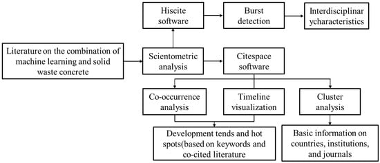 With the advancement of computational technologies, the application of ML in predicting the properties of concrete has grown rapidly. However, researchers still face challenges such as fragmented information, limited access to comprehensive insights, and difficulties in identifying emerging trends []. These limitations often hinder scholarly innovation and cross-disciplinary collaboration. To address these challenges, it is essential to employ scientometric techniques using specialized software tools to conduct systematic reviews. Such methods provide a structured, data-driven framework for mapping research developments, identifying influential publications, and uncovering knowledge gaps based on large-scale and trustworthy bibliographic data [,]. This study conducts a scientometric analysis of publications related to ML applications in waste concrete, based on records retrieved from the Web of Science (WOS) and China National Knowledge Infrastructure (CNKI) databases from 2011 to 2024. Scientometric methods enable the quantitative evaluation of extensive bibliographic datasets—an analytical capability that traditional narrative reviews often lack.