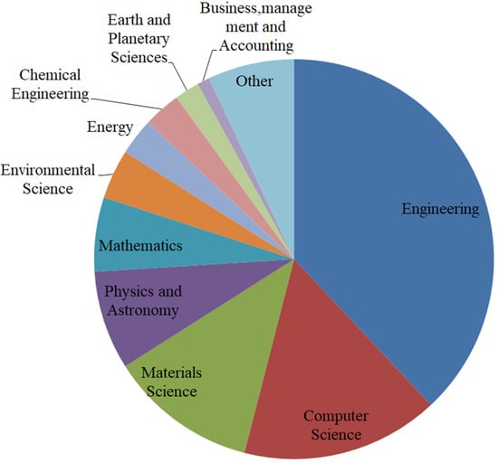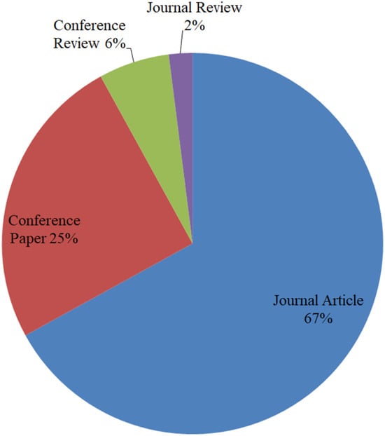 This assessment was conducted using Scopus Analyzer and Cite Space to identify the most relevant research domains. As shown in Figure 3, the top three disciplines contributing to the literature are engineering (38%), computer science (16%), and materials science (12%), together accounting for 66% of all retrieved documents. In addition, the types of publications in the Scopus database were analyzed (see Figure 4). Among the retrieved records, journal articles constituted the majority (67%), followed by conference papers (25%), conference reviews (6%), and journal reviews (2%). The analysis timeframe was set from 2011 to 2024. Around 2014, research on the application of ML in concrete began to take shape, coinciding with the maturation of foundational ML algorithms. At that stage, most publications focused on basic algorithmic models, which laid the groundwork for integrating ML into concrete research. Between 2016 and 2024, the number of publications increased steadily, reflecting growing interest in interdisciplinary approaches. During this period, a surge of studies emerged, featuring not only enhanced ML models but also a broader variety of waste materials. The field has since advanced both in algorithmic development and in the diversification of material types under study.