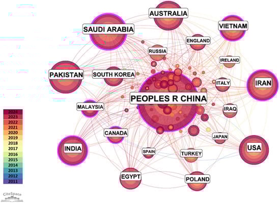 The research activity of a country is often evaluated based on the number of publications that it produces. From 2001 to 2023, a total of 68 countries or regions published studies related to the application of machine learning in waste concrete. To further explore the roles of different countries, we constructed an international collaboration network using Cite Space (Figure 5). In the graphical representation, the size of each node corresponds to the number of publications from a given country or region. Nodes highlighted with purple circles indicate higher centrality, typically reflecting stronger collaborative links with other countries in the network. Moreover, the thickness of the connecting lines between two nodes represents the frequency of collaboration among the respective countries or regions. As shown in the figure, the key countries in this field include China, India, Saudi Arabia, and Vietnam. These countries are represented by larger nodes surrounded by purple circles.