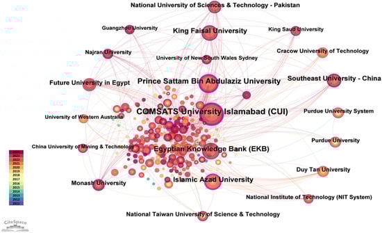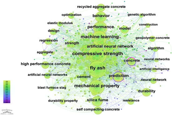 Based on author affiliations, a total of 184 institutions have made significant contributions to the research combining waste concrete and ML. The distribution of these institutions, visualized using Cite Space, is shown in Figure 6. In this network map, each node represents an institution, and node size is proportional to the number of publications produced by that institution. The majority of research institutions are concentrated in countries such as China, the United States, and India. For instance, Chinese institutions such as Southeast University [] and the Chinese Academy of Sciences [] have produced notable research in areas involving coal gangue powder concrete and vitrified concrete. In contrast, institutions in the United States [,] have placed greater emphasis on the optimization and application of ML algorithms. This geographical distribution reflects the differing national priorities in this interdisciplinary research area. As the field continues to evolve, an increasing number of institutions are integrating ML with disciplines such as materials science and environmental engineering. For example, some institutions [] have significantly improved predictive performance by introducing deep learning algorithms to optimize concrete mix design. Despite these advancements, the overall institutional collaboration network remains fragmented. Most institutions operate in isolation, with limited cross-institutional or cross-disciplinary partnerships, which hinders the broader dissemination and practical application of research outcomes. Therefore, establishing a collaborative platform that promotes inter-institutional and interdisciplinary cooperation is essential for accelerating future developments in the integration of ML and waste concrete research.