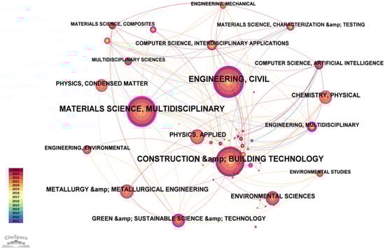 A disciplinary co-occurrence network was generated using Cite Space to analyze the thematic distribution of publications from 2011 to 2023 (see Figure 7). In total, 59 unique subject categories were identified across all retrieved records. Based on frequency and betweenness centrality metrics, Table 5 lists the top 20 most prominent categories in the network. The co-occurrence analysis revealed that categories such as Environmental Science, Civil Engineering, and Multidisciplinary Computer Science exhibit significantly larger nodes, indicating higher occurrence frequencies and stronger interdisciplinary connections. In this visualization, node size reflects the frequency of a subject category, while the number and density of connecting lines represent the extent of its linkage with other fields []. In addition to the core categories, disciplines such as Artificial Intelligence Engineering, Architecture and Building Materials, and Computer Science and Technology also play indispensable roles in this research domain. These findings highlight the strongly interdisciplinary nature of studies combining ML and waste concrete. For instance, the integration of Materials Science and Computer Science has driven the development of intelligent mix design for high-performance concrete, while the overlap between Environmental Science and Civil Engineering supports the advancement of sustainable construction practices. The prominent positions occupied by Environmental Science and Green and Sustainable Science and Technology in the network further reflect the growing demand for environmentally responsible and resource-efficient materials. However, as interdisciplinary collaboration deepens, new challenges have emerged. Notably, there is a significant lack of standardized datasets and harmonized experimental protocols across disciplines. This discrepancy increases research costs and reduces the comparability and reproducibility of results. Establishing unified standards and data-sharing mechanisms is therefore essential to support more coherent and impactful interdisciplinary research in this field.