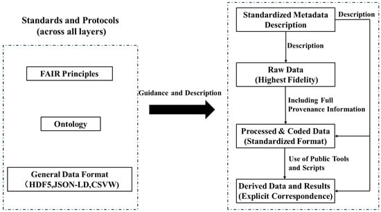 In response to the above issues, this paper proposes a general cross-disciplinary data framework, the basic workflow of which is illustrated in Figure 8. At the base of the pyramid lies the metadata layer, which employs standardized schemas (e.g., JSON-LD, XML Schema) to describe the dataset by capturing global identifiers, textual information, and contextual details. The raw data layer consists of unprocessed outputs directly obtained from instruments, such as images, sequence files, and measurement indicators. The processed and encoded data layer contains data that have undergone preliminary treatments (e.g., denoising, calibration, normalization) as well as encoded qualitative data. The derived data and results layer includes the final datasets used to generate figures and conclusions, which must be linked in an explicit and traceable manner to the processed data layer through scripts. This ensures that others can fully reproduce the derived datasets from the processed data using the provided scripts.