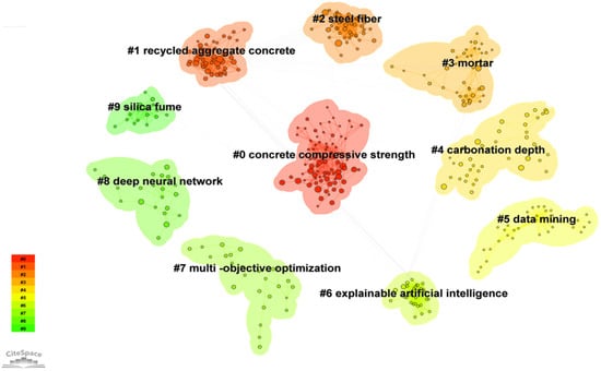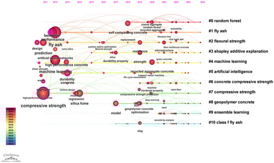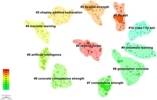 A total of ten keyword clusters were identified, with Cluster #0 emerging as the most significant. It achieved a Silhouette Score (S) of 0.848, indicating a high level of clustering reliability. In the visual map, contour shapes represent the degree of similarity between clustered keywords. Clusters #0, #3, #4, #5, and #9 primarily focus on ML algorithms, including topics such as model selection, optimization, and multi-model integration. Representative keywords include random forest, neural networks, ML, artificial intelligence, and deep learning. Clusters #1, #8, and #10 are associated with various types of waste concrete, such as geopolymer concrete, recycled aggregates, rubber concrete, and coal gangue powder concrete. Clusters #2, #6, and #7 focus on output indicators predicted by ML models, including compressive strength, durability, carbon footprint, and workability.