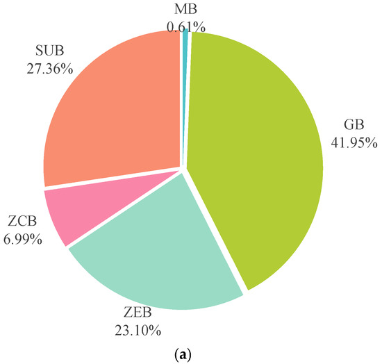 Categorical breakdown of building types. (a) Distribution of different building types (MB: Mixed Buildings; GB: Green Buildings; ZEB: Zero Energy Buildings; ZCB: Zero Carbon Buildings; SUB: Sustainable Buildings). (b) Publication number of different building types in each year.