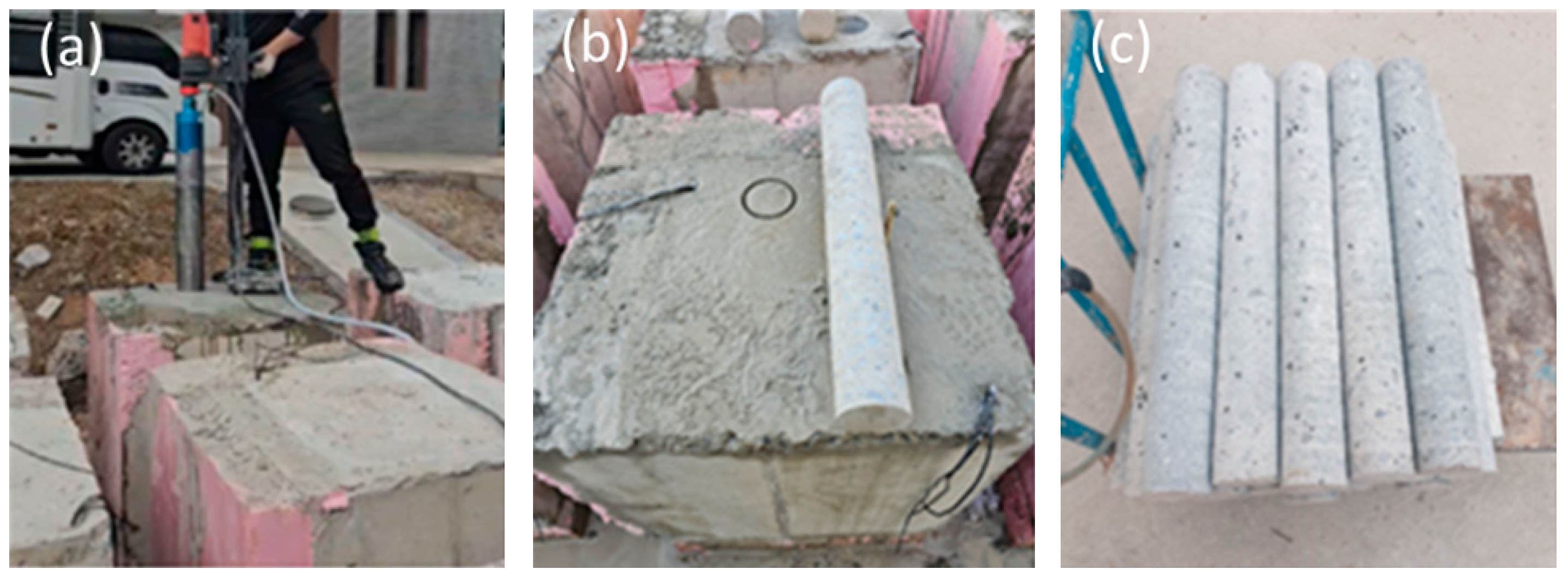 - Hasuo, K.; Matsuda, T. 1123 The effect of core sampling on concrete strength test results (Testing and Inspection (1), Materials and Construction, 2012 Annual Conference (Tokai), Academic Lecture and Architectural Design Presentation). Mater. Constr. 2012, 245–246. [Google Scholar]