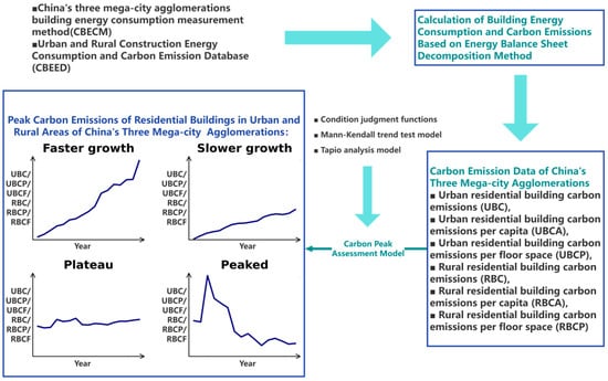 Historical trends in building carbon emissions across the three urban agglomerations present substantial challenges in the effort to achieve peak carbon emissions. Thus, evaluating these historical trends at the provincial level is essential for understanding the conditions surrounding peak carbon emissions. Analyzing the peak carbon emissions associated with buildings in these agglomerations will provide authorities with valuable insights into emissions at various stages, which is vital for developing effective carbon-neutral strategies for the residential construction sector. In light of this, this study proposes a comprehensive model to assess peak building carbon emissions in the three urban agglomerations, as detailed in Figure 1.