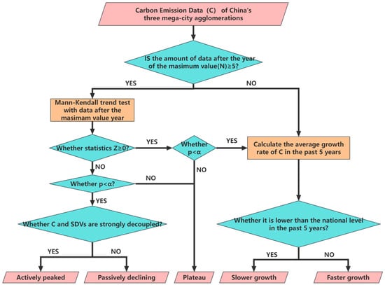 According to international standards, the peak of historical carbon emissions is defined as the point at which emissions in a region reach their highest level over a period of five years or more, compared to the most recent emission inventory. If this condition is not met, it cannot be considered a long-term trend. In this study, the historical evolution trends of BCE, BCEA, and BCEP in urban and rural areas are classified into four categories: peaked, plateau, fast growth, and slow growth []. The peaked category indicates a consistent downward trend following the peak, while the plateau category reflects only minor fluctuations after reaching the peak. The fast and slow growth categories denote stable growth rates, either rapid or gradual. Figure 2 illustrates the evaluation process of the peak situation. Below are the comprehensive steps involved in conducting the MK test and decoupling test: